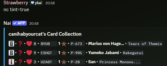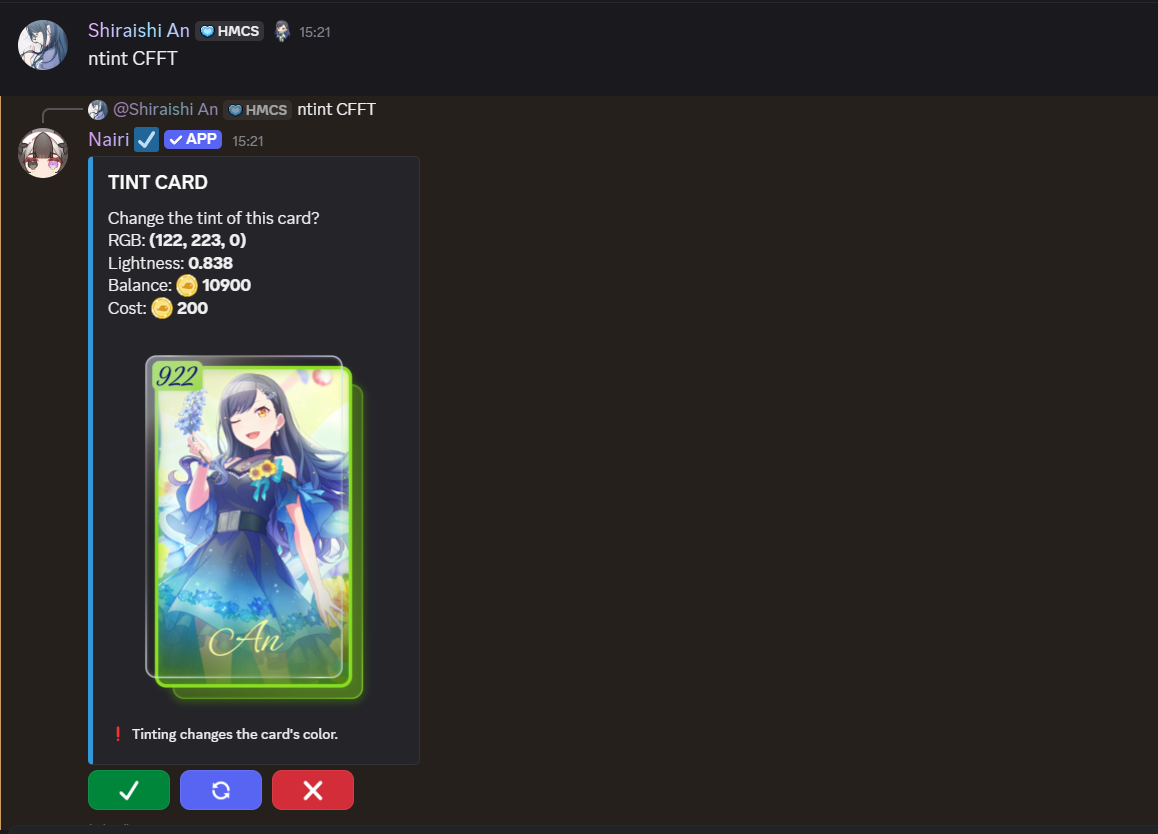 - To apply a tint, run the command <p>Tint <cardcode>.