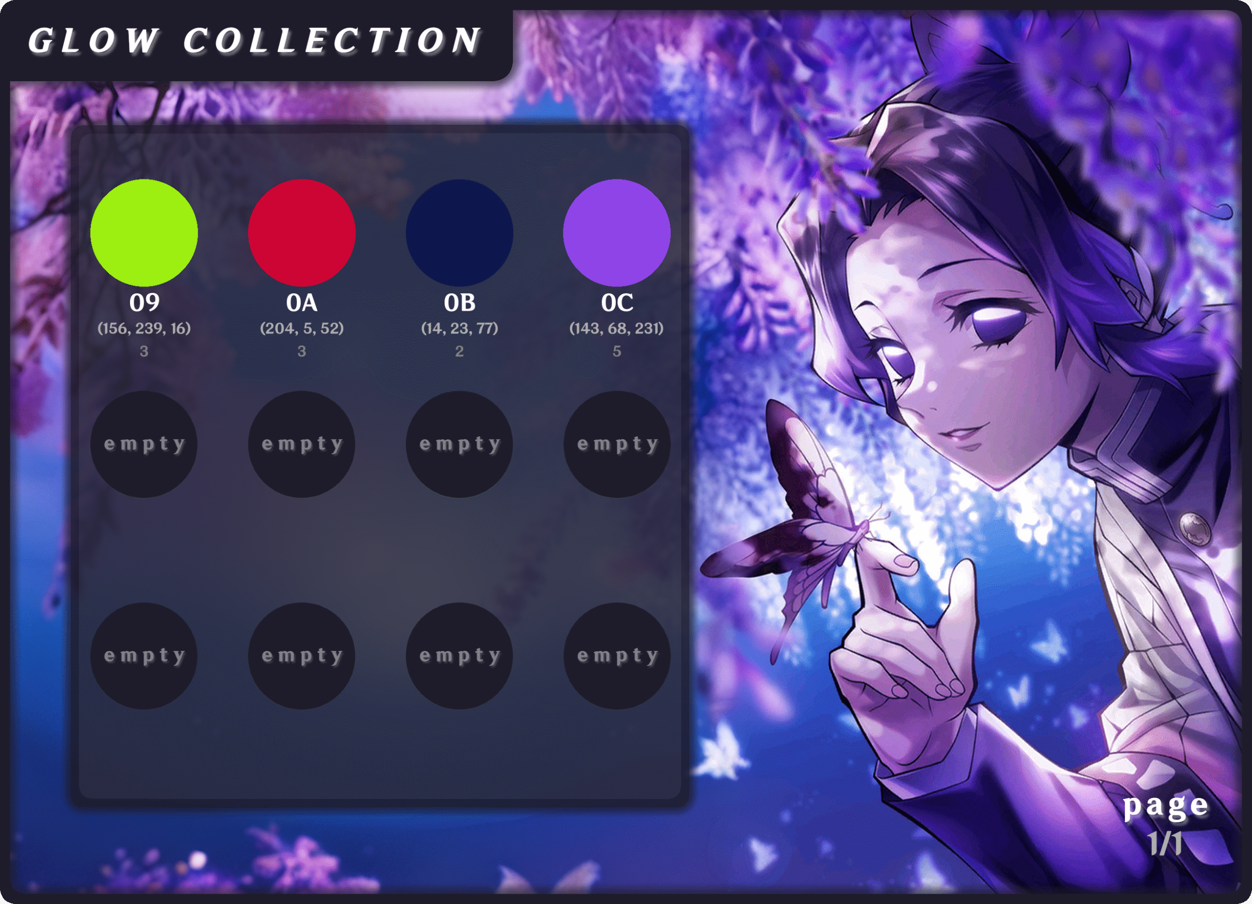 - You can view all your available glows in one place by using <p>GC or <p>Glowcollection.
