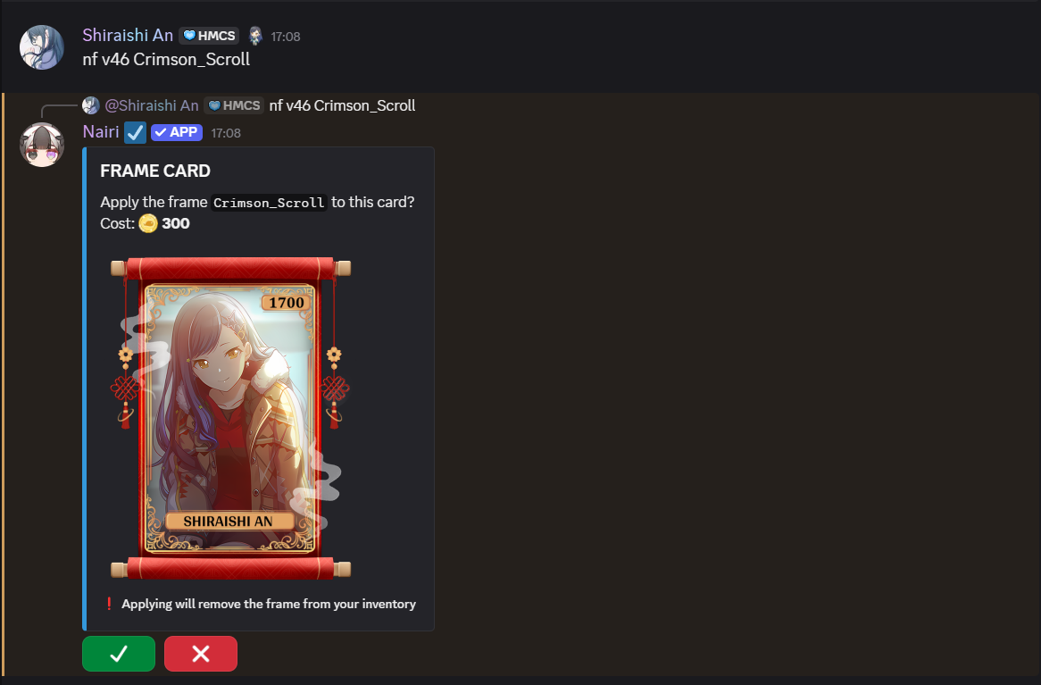 - You can now apply frames by using <p>F <cardcode> <framename> or <pf>Frame <cardcode <framename>.