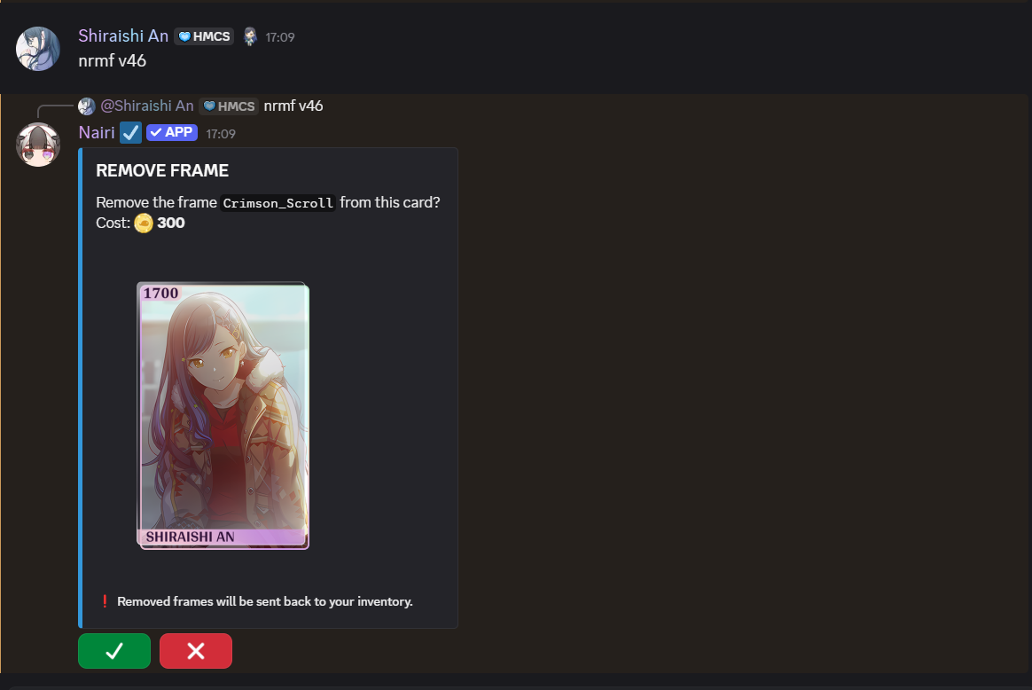 . - Note : running the <p>Rmf command without specifying a card code will apply the frame to your latest card.