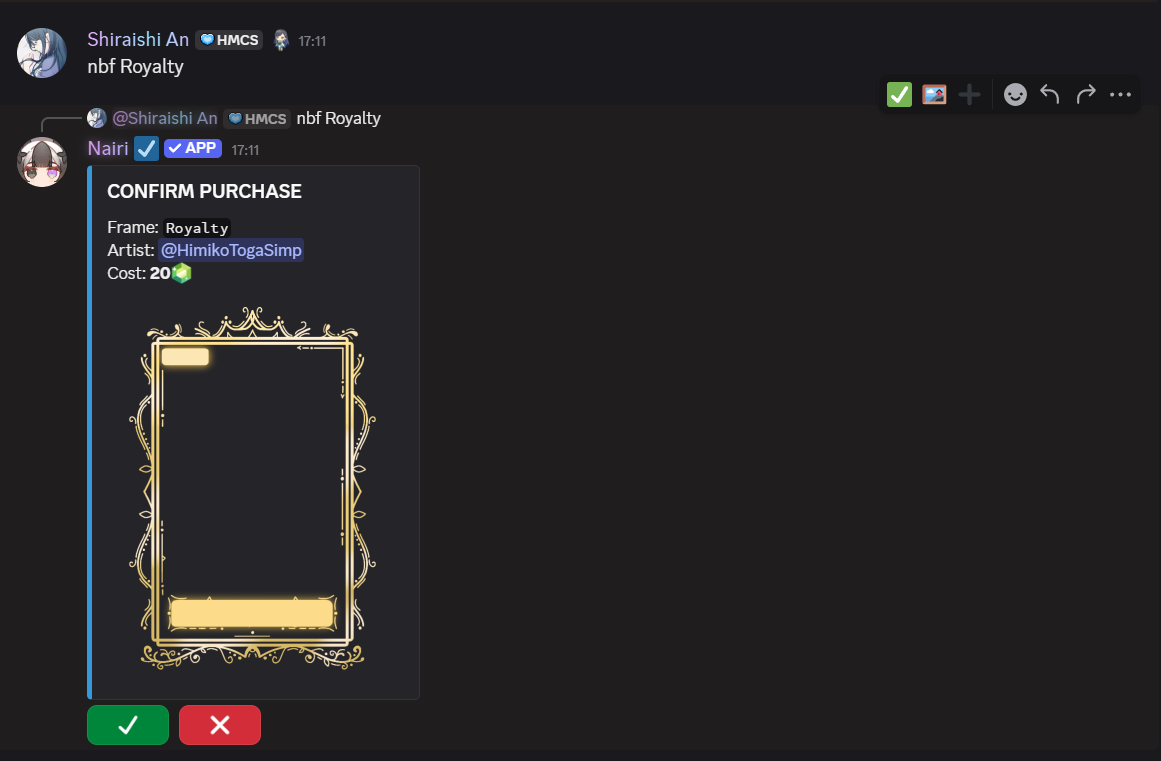 - You can check available frames in the shop by using <p>Bf <framename> or <p>Buyframe <framename>.