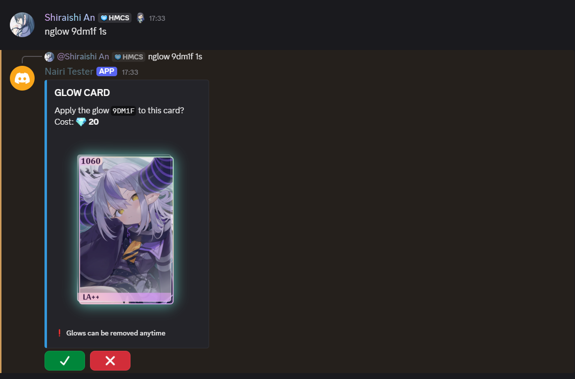 - You can glow a card by running the command <p>Glow <glowcode> <cardcode>.