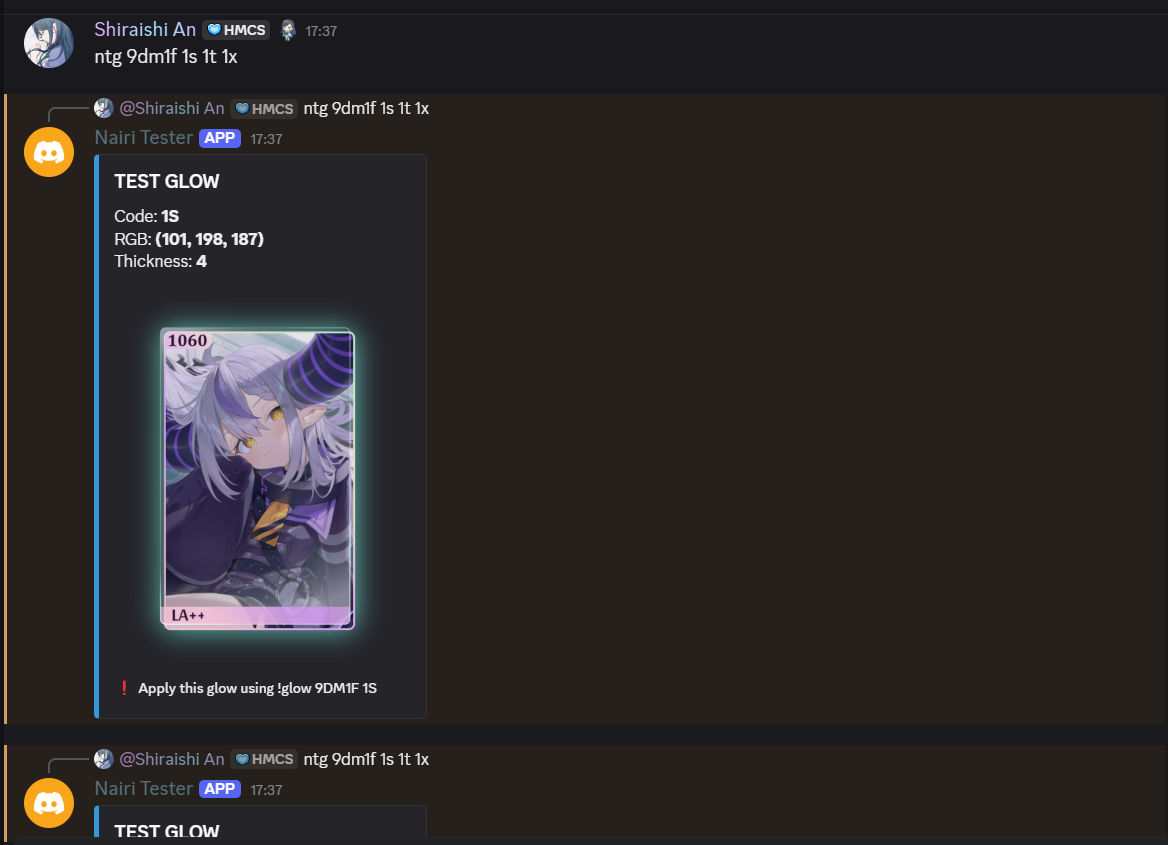 - You can test your glows on any card by running the command <p>Tg <cardcode> <glowcode> or <p>Testglows <cardcode> <glowcode>